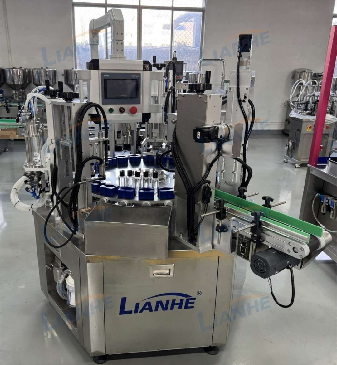 本次交付的設(shè)備包括轉(zhuǎn)盤(pán)式香水灌裝機(jī)、4 米輸送帶以及氣動(dòng)攪拌機(jī)。三臺(tái)設(shè)備協(xié)同運(yùn)行,可以達(dá)到香水生產(chǎn)過(guò)程中物料攪拌、灌裝及香水瓶輸送等關(guān)鍵環(huán)節(jié),有效提升生產(chǎn)效率并確保生產(chǎn)過(guò)程的穩(wěn)定性與一致性。